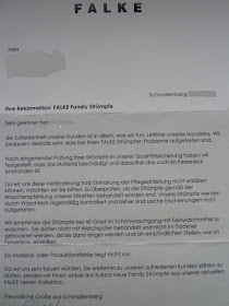 In meinem Post vom 02. Juli 2011 schrieb ich bereits von meinen gravierenden Problemen mit textilen Fußbekleidungen. Anscheinend haben aber auch Sockenfirmen eine Art Ehrenkodex; jedenfalls hatte ich jüngst eine Reaktion auf meinen gar garstigen Brief in meinem Briefkasten.