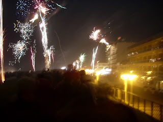 Unter allgemeinem Lärm und Getöse stoben diverse Raketen Richtung Himmel, wo sie zerplatzten und bunte Bilder in den dunklen Silvesterhimmel malten. Als jedoch die ersten Raketen eher waagerecht durch die Straße flogen, bequemte ich mich dann doch vor das Hotel, um die Ursache der Quertreiberei zu ergründen. Ungefähr zehn Meter von mir entfernt stand ein Mann, der nicht nur mit Bier, sondern vor allem mit vielen Raketen bestückt war, die er aus einer kleinen 0,3 Liter-Bierflasche heraus startete. Natürlich war diese gläserne Startrampe ein doch sehr wackeliges Konstrukt, so dass der nicht mehr ganz nüchterne Mann diverse Male korrigierend eingreifen musste, damit die Flasche samt Rakete nicht umfiel. Jedoch, wenn sie dann doch umfiel, war es dem Mann auch völlig scheiß-e-gal. Die Raketen flogen dann quer über die Straße und prallten an Häuserwände und Mobilklos, wo sie krachend explodierten.
